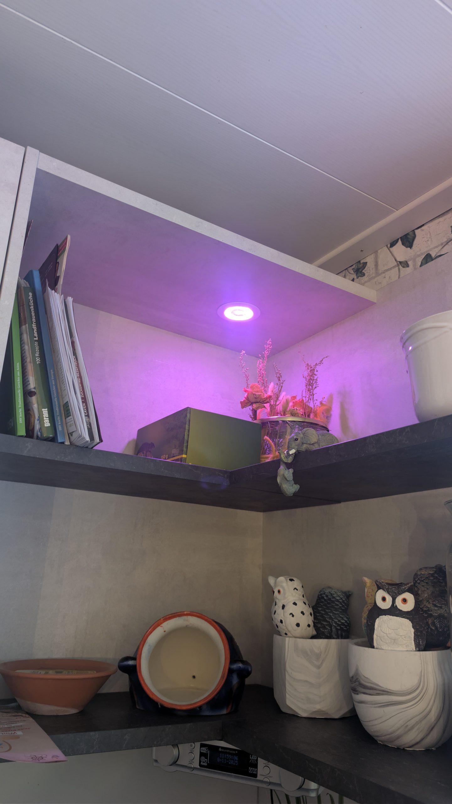 Für das Küchenregal wurde ein RGBW-Spot integriert, der sowohl funktionale Ausleuchtung als auch ästhetische Akzente bietet. Die gezielte Lichtführung hebt Gläser, Geschirr oder dekorative Elemente wirkungsvoll hervor und schafft eine hochwertige, moderne Atmosphäre.